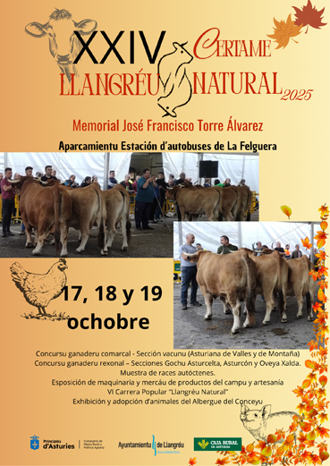 El domingo 19 de octubre, la apertura del recinto será a las 10,00 horas. Entre las actividades más destacadas figuran el Concurso de Gochu Asturcelta, con doma y calificación (11,00 h), la VI Carrera Popular “Llangréu Natural” (11,30 h), así como una exhibición y jornada de adopción de animales del Albergue Municipal (12,00 h). La entrega de premios se celebrará a las 13,15 h y la clausura oficial del certamen está prevista para las 15,00 horas. Además, a lo largo de todo el fin de semana, el público podrá disfrutar de una amplia muestra de herramienta y maquinaria agrícola, tanto nueva como de segunda mano, para venta y alquiler con demostraciones prácticas. A esto se le sumará un mercado de puestos artesanos y food trucks con carne de razas autóctonas.
