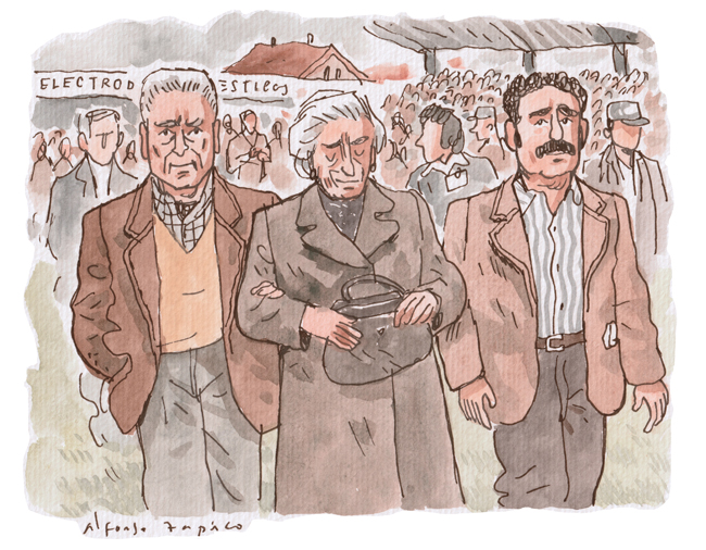El 28 de mayo de 1977 el campo del Ganzábal vivió una jornada histórica, y nada tuvo que ver con lo deportivo. Ese día la primavera y miles de personas recibieron en todo su esplendor a Dolores Ibárruri, “La Pasionaria”, en el estadio de fútbol langreano. Hacía tan solo 15 días que la líder del Partido Comunista de España había vuelto de su exilio de 36 largos años. Faltaban 18 días para que las primeras elecciones generales en demasiadas décadas la eligieran diputada por Asturias. Por eso estaba allí, para saludar a su “familia” minera. El discurso de La Pasionaria duró 9 minutos y sumó o 15 o 17 interrupciones (depende de las crónicas que leas de ese día). En una de las fotos más famosas de esa jornada se la ve a ella caminando por el terreno de juego y escoltada por dos hombres: a su derecha Horacio Fernández Inguanzo, “El Paisano”, y a su izquierda Vicente Gutiérrez Solís, máximo responsable del PCE en Langreo y encargado de abrir el acto. En esa foto está basado el dibujo que acompaña a este texto y que realiza mi amigu Alfonso, que cuando le comenté de lo que iba a escribir me dijo: “No tenía pruebas pero tampoco dudas”.