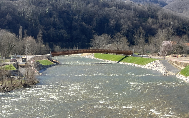Los trabajos de su colocación fueron exactos. Dos grandes convoyes llevaron las dos piezas de la pasarela peatonal, que se ensamblaron sin mayores problemas en un trabajo que duró varias horas debido a su complejidad. Muchos vecinos siguieron de cerca los trabajos. Habrá además una segunda pasarela, de dimensiones mucho más modestas, que salvará el canal del molino de agua existente en la zona. También se creará «un área recreativa de 42.000 metros cuadrados en la que se podrían incluir paneles informativos del ecosistema del entorno, que podrían expandirse a lo largo del paseo fluvial».
