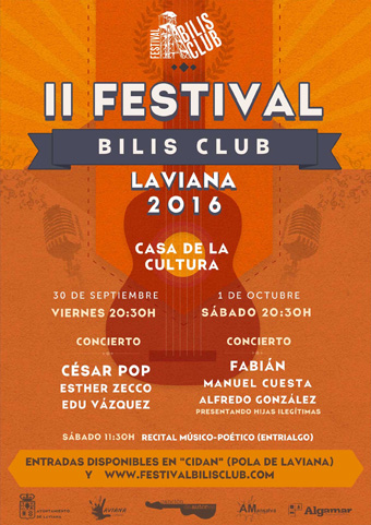 Los días 30 de Septiembre y 1 de Octubre de 2016 se celebró la 2ª edición del Festival Bilis Club en la Casa de la Cultura de Pola de Laviana, a partir de las ocho y media de la tarde. Este año en versión otoñal, se consolidó un festival nacido para reivindicar y divulgar la creación artística original, con la canción de autor y la literatura como elementos centrales del certamen.